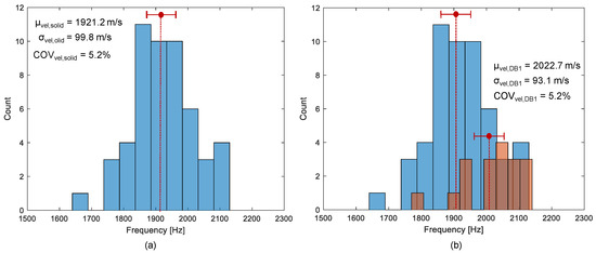 Histograms representing the distribution of the average phase velocity of concrete measured on: (a) the solid concrete region (blue), and (b) the de-bonded test region 1 (brown).
