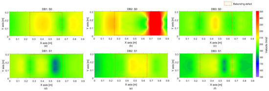 Spatial distribution of the average phase velocity of concrete measured on the de-bonded test regions solid: first (a,d), second (b,e) and third (c,f) columns represent the debonding defects 1, 2 and 3, respectively, and top (a–c) and bottom (d–f) rows represent the results measured by impact sources at S0 and S1, respectively.