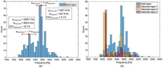 Histograms of peak frequencies obtained from a single accelerometer on: (a) the solid region, and (b) the debonding regions in the concrete slab track specimen.