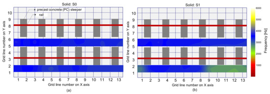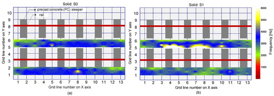 Spatial distribution of peak frequencies obtained from a single accelerometer on the solid region: (a) using an impact source at S0, and (b) using an impact source at S1.