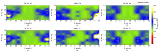 Spatial distribution of the average peak frequency values determined by average of eight spectral amplitude signals measured by the multi-channel IE sensor array over the de-bonded test regions: first (a,d), second (b,e), and third (c,f) columns represent the debonding defects 1, 2, and 3, respectively, and top (a–c) and bottom (d–f) rows represent the results measured by impact sources at S0 and S1, respectively.
