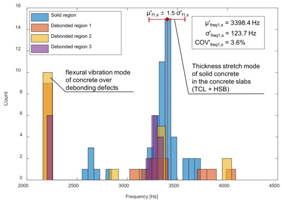 In contrast, histograms representing the distribution of peak frequency values over the three debonding defects (DB1, DB2, and DB3) are shown in Figure 14b. Dominant peak frequency values are concentrated in a narrow frequency range of 2000 Hz to 2200 Hz, with a mean value of 2100 Hz and a standard deviation of 20 Hz (COV = 0.9%). This value is highly compatible with the predicted fundamental frequency of flexural vibration mode by the semi-analytical equation, 2100 Hz, based on the geometry of the debonding defects (c/h = 1.70, 1.74, and 1.78), and P-wave velocity of 4000 m/s. Therefore, it can be inferred that the dominant peak frequency can be interpreted as the flexural vibration mode of concrete over a debonding defect. Figure 16, representing the spatial variation of peak frequency values, clearly shows the location of the debonding defects at the interface between TCL and HSB which is characterized by green colors, two standard deviations of the mean value. This peak frequency distribution associated with the debonding defects is clearly separated from the primary peak frequency values. However, it is noticed that those overlaps with the lower bound of the secondary peak frequency measured on the sound concrete. Consequently, some sound test regions could be misinterpreted as damaged regions or vice versa. Generally, the error level increases as the overlapped area in the two distributions increases. The presence of the multiple peaks in the solid concrete region could increase difficulties in the interpretation of the IE data in actual concrete slab tracks.