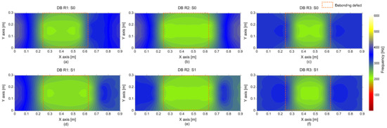 Spatial distribution of peak frequency values obtained from a single accelerometer measured on the de-bonded test regions: first ((a,d)), second ((b,e)), and third ((c,f)) columns represent the debonding defects 1, 2, and 3, respectively, and top ((a–c)) and bottom ((d–f)) rows represent the results measured by impact sources at S0 and S1, respectively.