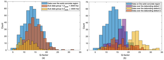 Histograms representing the distribution of Q factor values measured using a single accelerometer on: (a) the solid concrete region and (b) the test region including the debonding defects 1, 2, and 3.
