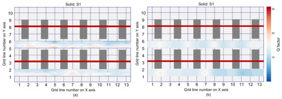 Figure 21 shows the spatial distribution of Q factors in the solid test region by IE testing using an impact source located at S1. Figure 21a,b are based on the Q factor values measured by a single accelerometer and the averaged Q factor values measured by eight accelerometers, respectively. By inspection of the distribution characteristics, the test regions that have Q factor values less than 15 are depicted as blue color in the Q factor maps, and other test regions are presented as red color. It is observed that most regions in the solid concrete are presented in blue color. Therefore, solid concrete regions can be characterized as dynamic responses with relatively low Q factor values (i.e., lower than 15 in this study).