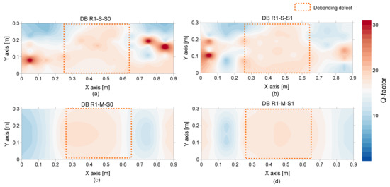 Spatial distribution of Q-factor values over the de-bonded test region 1 (DB1): first (a,b) and second rows (c,d) show the values based on a single spectral amplitude measured by a single accelerometer and the average spectral amplitude measured by eight accelerometers, respectively, and lest (a,c) and right (b,d) columns show the values based on an impact source at S0 and S1, respectively.