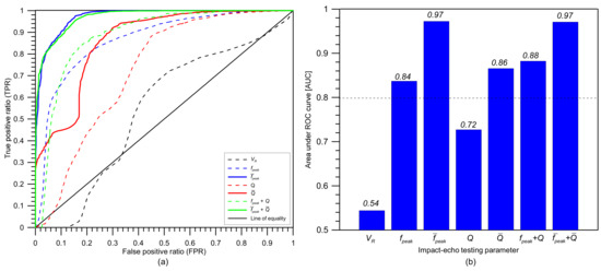 Figure 23 a represents the receiver operating characteristic (ROC) curves for the bilinear classification models with various characteristic parameters from multi-channel IE testing in this study. An ROC curve represents the relationship between true positive ratio (TPR = TP/(TP + FN)) with false positive ratio (FPR = FP/(FP + TN)) determined from various threshold values of a parameter. Figure 23b shows the area under the ROC curves (AUC) associated with different parameters. The AUC value is a good indicator of the overall performance of the classification model in a certain range of threshold values compared to a perfect model, with an AUC value of 1.0. The parameter that results in the AUC value closer to 1.0 is interpreted as to be a more effective parameter in a classification model. Overall, the prediction models based on the averaged values from multi-channel data exhibit higher AUC values than those based on single-channel data. To be more specific, the equally highest AUC values (0.97) resulted from the prediction model based on the average peak frequency () and the combined average peak frequency and averaged Q factor ( and ). The effectiveness of using the Q factor as a supplementary parameter is more clearly observed in the prediction model based on single-channel IE data. The use of dual parameters ( and ) improves the AUC value by about 5% (or 18%) compared to the model based on a single parameter of (or ).
