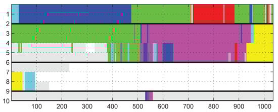 Graphical display of human groups. Persons with ID 1–10 are grouped from timestamp 1–1000. Persons in one group are marked with same color. Blank space means no data, and gray space means that person currently does not belong to any group.