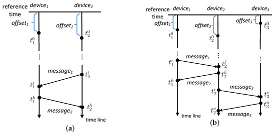 By solving the inequalities, we obtain the time deviation of the two devices offset−offset∈ [, ]. A message from device to device determines the upper bound of offset−offset while a message from device to device determines the lower bound of offset−offset. A bidirectional message determines the time interval for offset−offset. The length of the time interval is the sum of the two messages’ transmission durations.