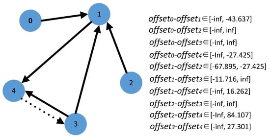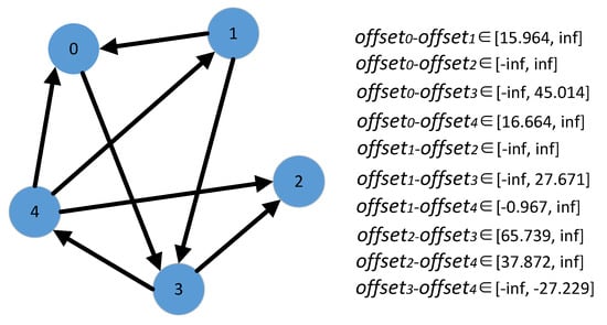 An example is shown in Figure 5 in which there are five messages initially. According to our approach, the next message to be passed should be from vertex 4 to vertex 3. By adding this message, offset−offset will be bounded by [−infinite, −54.233], offset−offset will be bounded by [−11.716, −10.596], offset−offset will be bounded by [15.092, 16.212], offset−offset will be bounded by [−infinite, 57.299] and offset−offset will be bounded by [26.808, 27.301], five infinites can be eliminated. This message is the best one for eliminating the number of infinites. For example, if a message is from vertex 1 to vertex 3, offset−offset will be bounded by [−infinite, −54.501], offset−offset will be bounded by [−11.716, −10.864], and offset−offset will be bounded by [−infinite, 57.031]. There are three infinites that can be eliminated.