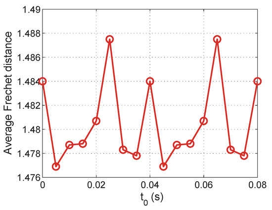 We first check the Frchet distance between the synchronized data and the real data with different t. The result is shown in Figure 6 where F is set to 3s and f is set to 0.04s. The average Frchet distance changes periodically with the change of t. Different values of t lead to different Frchet distances. The minimum value is achieved when t equals 0.005, which matches the result of our approach in previous sections.