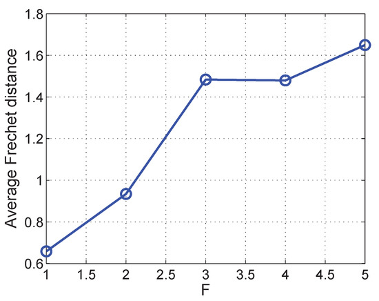 We further check the Frchet distance between the synchronized data and the real data with different values of F. f is set to 0.04 s. Figure 7 shows the result. The proposed approach is more effective when F is small. As F increases, the average Frchet distance slightly increases. This is because sparser location data in the trajectory are obtained at a larger F, and therefore less real data are collected. However, the aligned trajectory interpolation in our approach alleviate the increase of average Frchet distance.