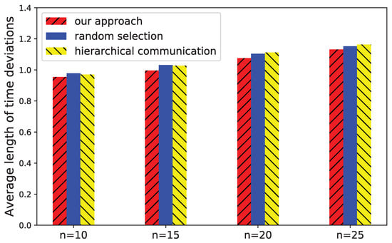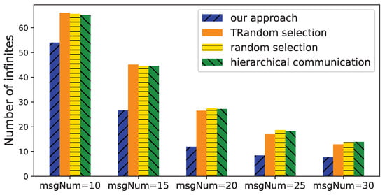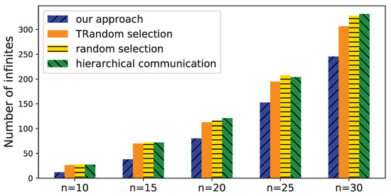 We first change the number of devices n from 10 to 30 to check the number of infinites when estimating their time deviations. The number of initial messages is set to to simulate an unconnected communication structure in the system. The results are shown in Figure 9. When the number of devices increases, the number of infinites increases. TRandom selection slightly outperforms random selection because the former combines the strongly connected component of the graph, and hence, avoid invalid messages in it. TRandom selection, random selection, and hierarchical communication show similar performance because they all use a random strategy for adding a new message. Our approach outperforms the other approaches because the messages are optimized to explicitly reduce the number of infinites. In a typical scenario where the number of devices is 20, the number of infinites of our approach is 71.2% of TRandom selection, 68.9% of random selection, and 66.3% of hierarchical communication.