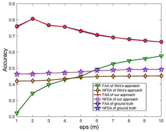 Finally, we evaluate the group recognition results of our approach compared with the ground truth and the approach proposed by Wirz et al. [12]. The real data are generated by selecting 91 pedestrians from ATC pedestrian group data set [38] and the collected data are supposed deviated randomly within (−15 s, 15 s) to the real data. The ground truth is based on the real data, and our approach performs time deviation elimination. For the fairness of comparison, we apply the aligned trajectory interpolation algorithm in each time snapshots for all the approaches. In every snapshot, the humans are grouped by their locations. Then, we evaluate the grouping result by the average FAA and NFDA in the snapshots. In the experiments, we check the average FAA and NFDA in different values of eps, the radius of neighborhood in DBSCAN. The result is shown in Figure 12. Compared with that of the ground truth, the FAA and NFDA when using Wirz et al.’s approach decrease a lot. It validates that the time deviations affect the group recognition accuracy. The FAA and NFDA when using our approach are close to the ground truth, which validates the effectiveness of our proposed estimation and elimination approach.