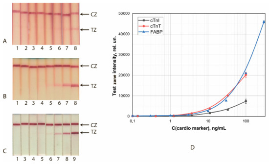 LFIA of cardio markers by test systems using the conjugates GNSs (30 nm)—Ab2/cTnI (A), GNSs (30 nm)—Ab4/cTnT (B), and GNSs (20 nm)—Ab6/FABP (C). (A–C) appearance of test strips after analysis of samples containing 0 (1), 0.1 (2), 0.4 (3), 1.2 (4), 3.4 (5), 11 (6), 33 (7), 100 (8), and 300 (9) ng/mL of the analytes. (D) Dependence of the intensity of coloration of the TZs on the concentration of antigen.