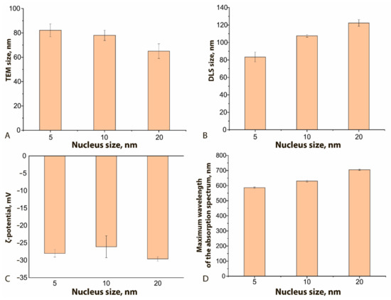 Influence of the nucleus size on GNFs’ physical characteristics: (A) TEM size, nm; (B) DLS size, nm; (C) ζ-potential, mV; (D) maximum wavelength, nm. C (HAuCl4) = 0.12 mM; C (nuclei) = 0.5% v/v for all samples.