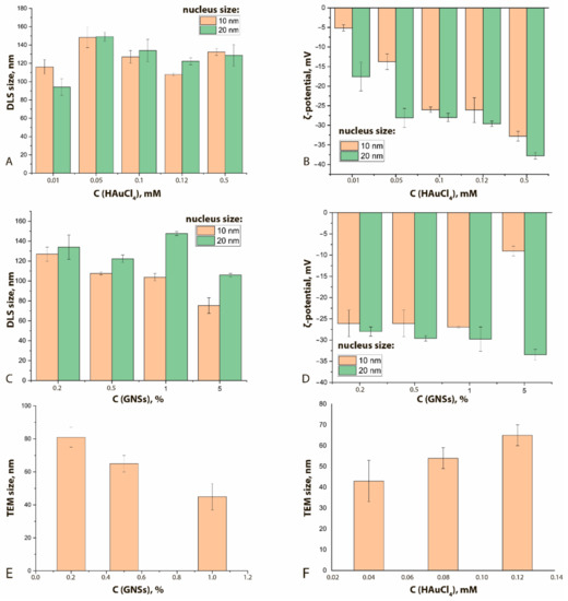 Influence of HAuCl4 concentration on the hydrodynamic diameter (A) and on ζ-potential (B) of GNFs (C(nucleus) = 0.2%). Influence of the concentration of nuclei (%) on the hydrodynamic diameters of GNFs (C) and on the ζ-potential (D) (C(HAuCl4) = 0.12 mM). Influence of the concentrations of nuclei (%, (E)) and HAuCl4 (mM, (F)) on the TEM-registered average diameters of GNFs (nucleus size 20 nm).
