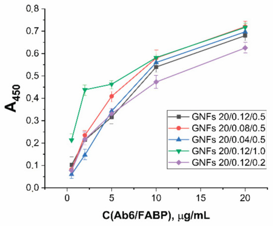 For the selected GNF preparations, conjugates with antibodies specific to cardio markers were obtained. Unlike GNSs, GNFs have no literature recommendations for the choice of the number of immobilized antibodies that would provide the minimum LOD. The properties of conjugates with GNFs obtained at different ratio reagents were compared experimentally using antibodies to FABP as an example. The synthesis was carried out for GNFs (A = 1.0) and Ab6/FABP at concentrations from 0.5 to 20 μg/mL. Separated from unreacted antibodies, the resulting preparations were characterized by ELISA (see Section 2.7) for binding to FABP immobilized in microplate wells. The results obtained (Figure 6) indicate the concentration dependence did not reach saturation in any case. Over the entire range of antibody concentrations (up to a concentration of 20 μg/mL, twice as high as 10 μg/mL, selected for analogous synthesis with GNSs), an increase in antibody concentration was accompanied by an increase in conjugate binding.