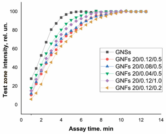 GNFs differ from GNSs in size and shape, which could affect the velocity of their movement along the test strip. This parameter is an important characteristic of immunoreagents that affects not only the time required to complete the analysis and obtain results but also the degree of approximation to the equilibrium of the reaction between the antigen in the sample and the antibody–nanoparticle conjugate during movement along the membrane and the quantity and composition of the resulting immune complexes. In this regard, the dynamics of color development in the TZ were studied using Ab6/FABP–antibody conjugates with GNSs and with different types of GNFs. The results obtained are presented in Figure 8.