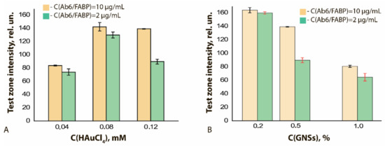 If the HAuCl4 concentration was fixed and equal to 0.12 mM, and if the nucleus concentration increased from 0.2% to 1.0% (GNFs 20/0.12/0.2, GNFs 20/0.12/0.5, and GNFs 20/0.12/1, respectively), then the marker binding in the TZ decreased by two times (from 160 rel. un. to 80 rel. un.), and the LOD of FABP changed from 11 to 1.5 ng/mL (Figure 9B). This effect can be explained by the fact that a decrease in the concentration of crystallization centers (nuclei) leads to the formation of larger particles detected in smaller amounts. The aforementioned TEM data for GNFs confirm this interpretation; the average diameters of GNFs in the series under consideration increased from 43 to 81 nm.
