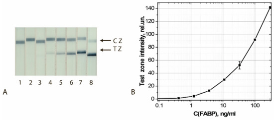 A working nitrocellulose membrane was processed using an IsoFlow dispenser (Imagene Technology; Lebanon, NH, USA). To form a control zone (CZ), a GAMI solution with a concentration of 0.5 mg/mL in PBS containing 0.25% w/v BSA, 0.25% w/v sucrose, and 0.1% w/v sodium azide was used. To form the test zone (TZ), solutions of Ab5/FABP (1.0 mg/mL), Ab1/cTnI (2.0 mg/mL), or Ab3/cTnT (2.0 mg/mL) in the same buffer were used. Of each solution, 32 μL was applied per 240 mm of the width of the sheet of the working membrane.