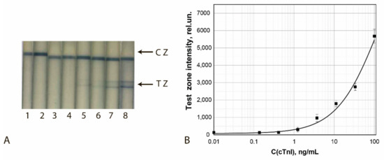 Detection of cTnI in buffer by LFIA using the conjugate GNFs (10/0.12/0.5)–Ab2/cTnI. (A) Appearance of test strips after analysis of samples containing 0 (1), 0.4 (2), 1.2 (3), 3.7 (4), 11.1 (5), 33.3 (6), 100 (7), and 1000 (8) ng/mL of cTnI. (B) Dependence of the coloration intensity of the TZs on the concentration of cTnI.