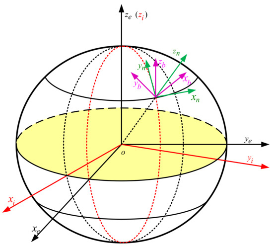 The rest of this paper is organized as follows. Section 2 defines the standard inertial coordinate system. Section 3 introduces the error model of the ship’s large misalignment strapdown inertial navigation system. Section 4 designs the improved UKF algorithm and constructs an alignment model based on the KF-ASMUKF hybrid filter algorithm and its steps. Section 5 designs simulation and offshore alignment test to verify the effectiveness of the method. Section 6 gives the conclusion.