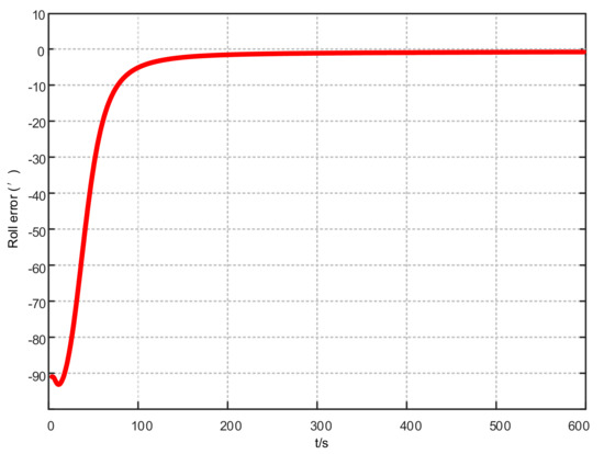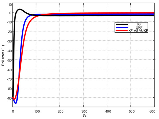 Roll error results based on KF-ASMUKF hybrid filtering algorithm.