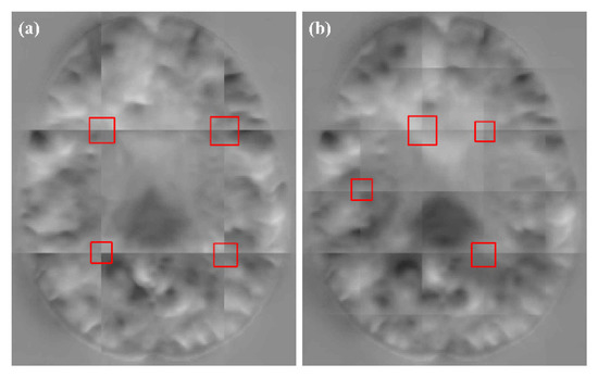 In the patch-based image registration method, due to the image features in the patch edges being incomplete, the patch prediction at the patch edges is less accurate. In addition, the extraction of patches using sliding windows with different strides also produces different degrees of grid-like artifacts. In Figure 3a, when the stride is consistent with the patch size, there is no overlap between the patches, which leads to severe grid-like artifacts after fusion, due to the inconsistent information of each patch edge. When the stride is smaller than the patch size, the AAW is generally used for the overlapping regions. The weights of the overlapping regions are the same no matter how far away from the center they are. The same grid-like artifacts will appear, as shown in Figure 3b. In the patch-based training method, the central region is more informative than the edge region. It is not reasonable to use the same weight for the edge region and the central region. Therefore, this study set the weight using an exponential function which was calculated by the distance from the points in the patch to the center point.