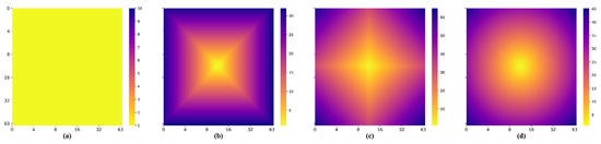 The heat map of the weights used by the AAW method, and the distances obtained by using different distance functions in the 33rd slice of a 64 × 64 × 64 voxels patch. (a) AAW method; (b) Chebyshev distance; (c) Manhattan distance; (d) Euclidean distance.