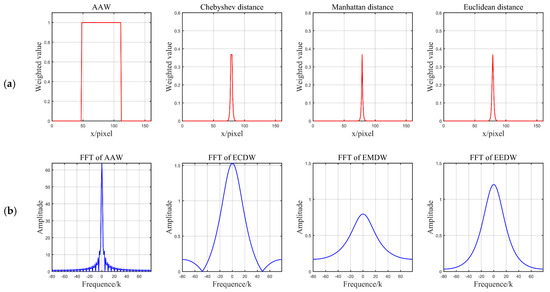 In Figure 4b–d, the deep blue color indicates a large distance from the center point, and the deep yellow color indicates a small distance. It can be visualized that all three distance functions become smaller when they are closer to the center point. In addition, they increase from the center point to the surrounding area in a square, star, and circle manner, respectively. Additionally, in the heat map of the AAW method, the colors are the same for all positions, indicating that each position receives the same weight. From the frequency domain analysis (Figure 5), the amplitude of the AAW method oscillates, indicating that it still had more high-frequency components. From the amplitude of the Chebyshev distance function, we observed that it also retained a small number of high-frequency components. Therefore, these two methods would still have grid-like artifacts on DDFs. The amplitude of Manhattan distance and Euclidean distance are relatively stable, which can achieve the purpose of removing grid-like artifacts while preserving the original information.