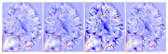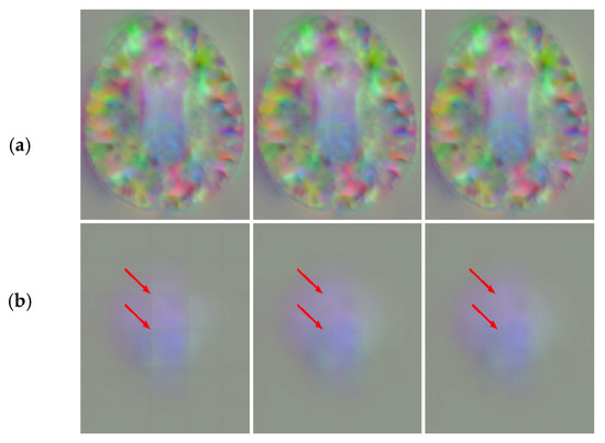 In Table 3, when the stride decreases, the smoothness of DDF increases with a smaller . However, the DSC of the CSF, GM and WM are nearly similar. As the number of patches increases with a small stride, the fusion time is significantly increased. Compared with the AAW method, the DSC and values of our method are higher than those obtained by AAW under different strides. We found that the stride had little effect on the obtained by our method, while the AAW method obtained a smoother deformation field with smaller strides. This further proves that our method can robustly maintain the predicted values of the registration model. In addition, the fusion times of the two methods has little difference. In Figure 10, we found that the DDFs of our method under different strides removed the grid-like artifacts, but the AAW method still has a small number of grid-like artifacts, even at a stride of 4 × 4 × 4. We can conclude that to obtain the DDF without grid-like artifacts, the AAW method requires a smaller stride while significantly increasing the fusion time. However, our method can obtain the DDF without grid-like artifacts in a shorter time, even under a larger stride, as well as a higher DSC value than that obtained by the AAW method.