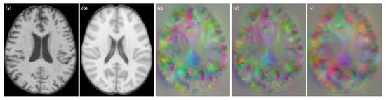 Experimental data were obtained from The Open Access Series of Imaging Studies (OAISIS-3) (https://www.oasis-brains.org, accessed on 15 July 2021) [13]. The OASIS-3 dataset was a longitudinal imaging, clinical and cognitive dataset of both normal aging and Alzheimer’s disease. It included 609 cognitively normal subjects and 489 subjects with varying stages of cognitive decline. We randomly selected 800 TI-weighted (T1) subjects for the experiment. We used 750 subjects for training, 50 subjects for inference, and the MNI-152 brain atlas was used as the fixed image. In preprocessing, each subject was linearly aligned to the MNI-152 brain atlas. The final image size was 160 × 192 × 160 voxels with 1 × 1 × 1 mm3 voxel resolution. The dataset also contained segmentation label images of cerebrospinal fluid (CSF), gray matter (GM), and white matter (WM).