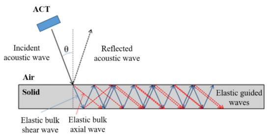 The air-coupled transducer generates the acoustic waves that propagate through the air. At the time instant at which the acoustic wave arrives to the solid, specimen is reflected as an acoustic wave from a specimen and transmitted to the specimen, where it converts to elastic bulk waves (longitudinal and shear). Due to the internal reflection of bulk waves in thin-walled structure, elastic guided waves are generated (Figure 1).