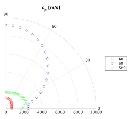 In this paper, the SASE model was developed for carbon fiber-reinforced polymer (CFRP) laminate composed of eight unidirectional reinforcing layers [0°]8 of a total thickness of 3.9 mm. It should be underlined here that the plate utilized in experimental research consists of 40 layers. However, due to fact that all layers are oriented at the same angle, eight layers in the numerical mode is enough to obtain good agreement with the experiment. Moreover, a reduction in the number of layers to eight allows reducing the complexity of the numerical model. Such parameters, such as phase velocity and wavenumber dependence of angle of propagation, were determined for a frequency of 40 kHz. Analyses were conducted for fundamental anti-symmetric A0 and symmetric S0 Lamb wave modes as well as for the shear horizontal SH0 elastic wave mode. In Figure 2, elastic wave phase velocity dependence on the angle of propagation for investigated elastic wave modes were presented.