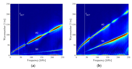 where —signals in the time–space domain, —the signal in the frequency–wavenumber domain, and —the wavenumber along the x direction. Based on noticed wavenumbers in the frequency–wavenumber plots, it was possible to determine which wave modes propagate in the plate.