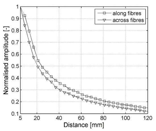 Another factor taken into account within point-wise measurements is the distance between the ACT and CFRP specimen surface. There were two measurement series performed for ACT direction along and across reinforcing fibers and signal sensing in one point (bellow ACT). The ACT was oriented perpendicularly to the plate surface and its distance from the plate was changed from 5 mm to 120 mm. Next, maximum signal amplitude values (vibration velocity) were extracted for each distance of ACT from the plate and normalized by maximum amplitude. Results in the form of normalized amplitudes are plotted in Figure 8.