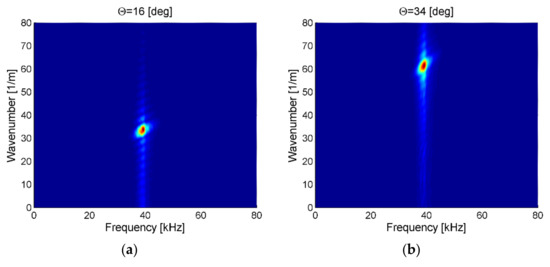 In Figure 10a, an example of the frequency–wavenumber plot for measurements in the case of ACT directed along fibers at the incidence angle θ = 16° was presented. In the case of the incidence angle θ = 16°, the maximum amplitude of elastic waves was achieved. The extracted wavenumber was equal 33.7 and was similar to the wavenumber for the fundamental antisymmetric Lamb wave mode A0 along fibers previously obtained from numerical and experimental results (see Table 1 and Table 2).