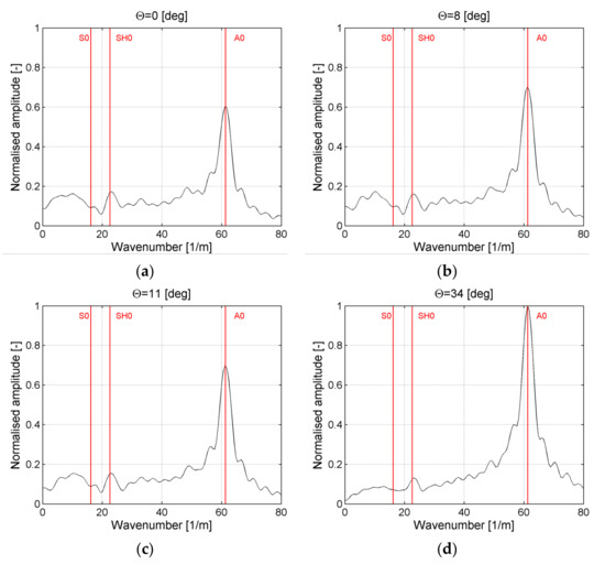 The first incidence of angle θ = 0° (Figure 11a) was related to the case when ACT was perpendicular to the plate. It could be noticed that maximum amplitude was related to the A0 mode extracted from the numerical model (vertical line) as well as from experimental results (Table 2). Its normalized amplitude was equal to 0.57. There was no significant energy (peaks) related to modes S0 and SH0. In the case of results in Figure 11b, ACT was oriented at the incidence angle θ = 2°, which is optimal for excitation of the S0 mode (Table 1 and Table 2). In this case, only the A0 mode was generated, but had a larger amplitude of 0.68 than in the previous case. The optimal angle for the S0 mode did not excite this mode. In the case of results presented in Figure 11c, ACT was oriented at the incidence angle θ = 11° which was optimal for the generation of the SH0 mode (Table 1). In this case, propagation of the A0 wave mode with an amplitude of 0.91 could be observed. There was a large number of wavenumber peaks but there was no peak that perfectly matches the wavenumber for the SH0 or S0 modes. In the case of results in Figure 11d, ACT was oriented at the incidence angle θ = 16° which was close to the optimal angle for generation of the A0 wave mode (Table 1 and Table 2). In this case, the largest amplitude for the A0 mode could be noticed and was equal to 1. In this case, a large number of peaks could be also noticed but no peak matches perfectly to S0 or SH0 wavenumber.