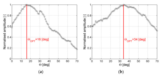 In Figure 13a amplitudes for the A0 mode in a function of ACT orientation angle for the case of waves generation along reinforcing fibers are plotted. It could be noticed largest amplitude was achieved for the incidence angle θOPT = 16°. In Figure 13b amplitudes for the A0 mode in a function of ACT orientation angle for the case of waves generation across reinforcing fibers are plotted. It could be noticed that the largest amplitude was achieved for the incidence angle θOPT = 34°.