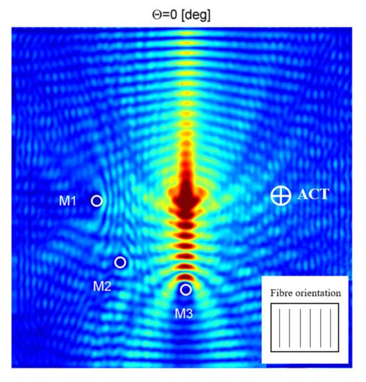 Based on numerical (Section 3) and experimental results (Section 5.1) optimal ACT angles for generation of the A0 elastic wave mode in the direction along (17°/17°—see Table 1/Table 2) and across (32°/32°—see Table 1/Table 2) reinforcing fibers were determined.