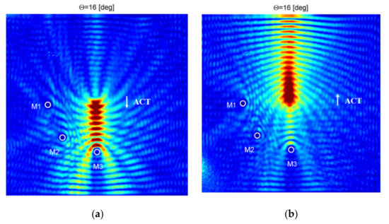 In Figure 16, an RMS energy map for the case when ACT is oriented at the optimal angle θ = 16° for the case of the A0 wave mode generation in the direction along reinforcing fibers is presented. In Figure 16a, RMS energy map for ACT directed in the bottom part of the plate is presented. Results are similar to the previous case. Wave energy is focused in direction of ACT (bottom part of the plate) and along the fibers. In this case, half the area of the considered plate is better covered by elastic waves (the area where elastic waves propagate with relatively high amplitudes is higher). Additional masses M1–M3 could be localized. A change in the elastic wave energy caused by discontinuity M3 is the largest. In Figure 16b, an RMS energy map for ACT directed in the top part of the plate is presented. Wave energy is focused in direction of ACT (the bottom part of the plate) and along the reinforcing fibers. Additional masses M1–M3 could be localized. It is interesting that discontinuity M3 could still be very easily localized besides the fact that ACT is directed in opposite direction (elastic wave energy is focused on the opposite part of the plate than M3 is located).