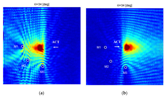 In Figure 17, RMS wave energy map for the case when ACT is oriented at the optimal angle θ = 34° for the case of the A0 wave mode generation in the direction across reinforcing fibers. In Figure 17a, an RMS energy map for ACT directed in the left part of the plate is presented. Wave energy is focused in the direction of ACT (the left part of the plate). Additional mass M1–M3 could be easily localized. In this case, half of the considered plate area (on the left) is better covered by elastic waves, i.e., the area where elastic waves propagate with relatively high signal amplitudes is higher. In Figure 17b, an RMS energy map for ACT directed in the right part of the plate is presented. Wave energy is focused in the direction of ACT (the right part of the plate). In this case, only discontinuity M3 could still be localized. In this case, when waves are generated and propagate across fibers, larger damping of the elastic wave mode A0 could be noticed (see the right part of the plate without discontinuity in Figure 17b) than in the case of waves generation and propagation along fibers (see the top part of the plate without discontinuity in Figure 16a).