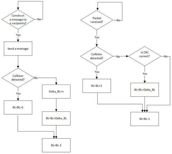 Backlog counting algorithm for transmitting nodes (left diagram), and for receiving nodes (right diagram) if the nodes are not equipped with collision detection.