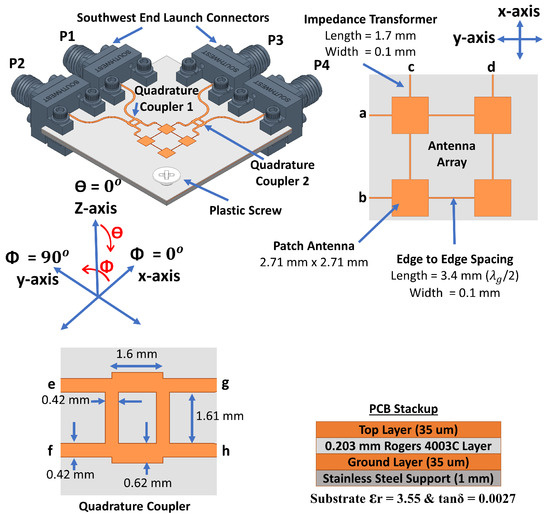 The optimized architecture of the proposed 2 × 2 series fed antenna array system is shown in Figure 1. The antenna array is designed to work at 28 GHz. The overall antenna size is 37.2 × 37.2 mm. Each one of the four square shaped patch antennas (2.71 × 2.71 mm) is radiating at 28 GHz and is fed from two ports through the impedance transformers. Those impedance transformers (L = 1.7 mm and W = 0.1 mm) are used to match the edge impedance of a single patch (400 ohms at 28 GHz) to 50 ohms at ports a, b, c, and d. Each of the edge-to-edge spacing transmission lines has a length of 3.4 mm and a width of 0.1 mm. Spacing between patch edges is designed to be equivalent to /2 so that phase is preserved the same between patch edges, where is the guided wavelength at 28 GHz for Rogers 4003C substrate. Ports a and b of the antenna array are connected to quadrature coupler 1 which is designed to operate at 28 GHz band. The other two ports of the antenna are connected to quadrature coupler 2. Those couplers are extended with longer transmission lines so that Southwest End Launch connectors can fit the design.