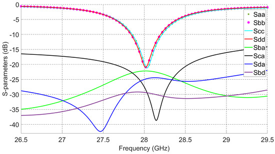 For the 2 × 2 series fed antenna array, each radiating patch is fed from its edges’ centers through two orthogonal feeds (impedance transformers). This feeding mechanism provides high interport isolations between ports a, b, c, and d at the intended operating frequency. The reason behind that is the polarization diversity; in other words, when the antenna is fed through ports a and b, the polarization will be across = 90, and when fed through ports c and d, the polarization will be across = 0. This orthogonality between both polarizations provides high isolation between orthogonal ports. For example, as shown in Figure 2, isolation between ports a and c is better than 15 dB from 26.5 GHz to 29.5 GHz and reaches around 40 dB at 28.1 GHz. The other ports have isolations better than 20 dB for the whole targeted frequency band. The 2 × 2 antenna array design can reach 360 MHz 10 dB impedance bandwidth and 650 MHz 6 dB impedance bandwidth, which can be used for mobile phone applications [28]. Such dual-polarized 2 × 2 series fed patch antenna array with high interport isolations provides 2D symmetric beam-scanning and steering capabilities with Low SLL [4].