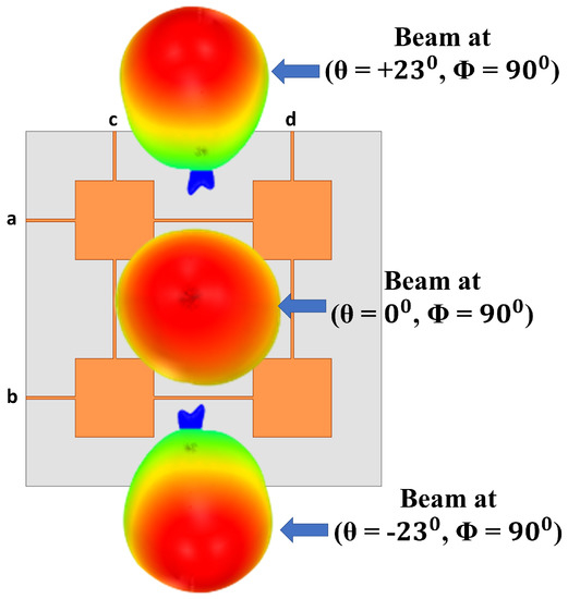 where and are the progressive phase differences between antenna array ports along with x and y directions, respectively. and are the inter-element spacing along with x and y directions, and in the current 2 × 2 series fed antenna array, they are 6.11 mm (≈0.57 at 28 GHz), and k is the wavenumber (2/) in free space. When only ports a and b are excited while ports c and d are terminated with 50 ohms, according to Equation (1), the beam will be directed to ( = +26, = 90) when the progressive phase difference () between ports a and b is +90 and it will be directed to ( = −26, = 90) when = −90. When = 0, the beam will be directed to ( = 0, = 90 polarization). The 3D view of those three beams is shown in Figure 3. The 90 progressive phase shift can be achieved by using quadrature couplers.