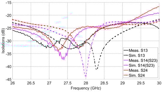 Quadrature couplers connected to the 2 × 2 series fed antenna array increase the 10 dB impedance bandwidth of the overall design when compared to the bandwidth of the 2 × 2 series fed antenna array alone. Those couplers have wide 10 dB impedance bandwidth at high frequencies. The measured and simulated isolations between antenna ports from different sides are given in Figure 6. The antenna array achieves better than 15 dB isolation from 26 GHz to 30 GHz and peak isolation better than 30 dB for any pair of dual-polarized ports. High interport isolation between the dual-polarized ports enables the designed array to achieve switching capabilities with high gain and low SLL.