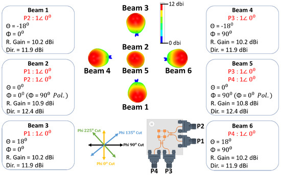 The antenna system shown in Figure 1 is simulated to verify the beam-switching capability of the 2 × 2 series fed antenna array connected to two quadrature couplers. The input ports of the two quadrature couplers are excited according to Table 1 to obtain ten (10) switched beams. For each simulated beam, directivity and maximum realized gain angle ( and ) are calculated and they are given in Figure 7 and Figure 8. The first six (6) beams shown in Figure 7 have an average realized gain of 10.4 dBi, and they are obtained by simulating ports from one side of the antenna system. Three (3) beams are obtained along with Phi 0 cut when using the antenna side of ports 1 and 2 while terminating ports 3 and 4. The other three (3) beams can be obtained along with Phi 90 cut when using the antenna side of ports 3 and 4 and terminating the other two ports. For example, exciting port 2 only and terminating each of the other three ports with 50 ohms loads generates beam 1 at ( = −18, = 0) with a maximum realized gain of 10.2 dBi and directivity of 11.9 dBi. Exciting port 1 only will switch the beam to ( = +18, = 0), which is beam 3 with a realized gain of 10.2 dBi, and when both ports 1 and 2 are excited simultaneously with in-phase and equal current magnitudes, beam 2 is obtained at ( = 0, = 0) with a realized gain of 10.9 dBi. The polarization of beam 2 is across = 90 cut. The other three beams (beams 4, 5, and 6) with similar angles across = 90 cut and with similar realized gain values can be obtained when using the antenna side of ports 3 and 4 and terminating each of the other two ports with 50 ohms. Beams 2 and 5 have the same angle ( = 0), but they have different polarizations.