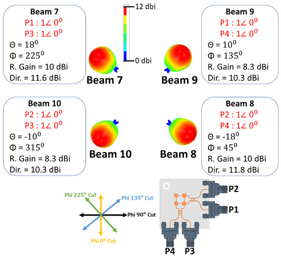 In-phase and equal current magnitude excitations of two ports simultaneously from both sides of the antenna system can generate four (4) switched beams as depicted in Figure 8. When ports 1 and 3 are excited at the same time, the antenna’s main beam switches to ( = +18, = 225), which is beam 7 with 10 dBi realized gain, and when ports 2 and 4 are excited simultaneously, beam 8 at ( = −18, = 225) is radiated with 10 dBi realized gain. The last two beams (9 and 10) are directed to ( = ±10, = 135). Both beams have 8.3 dBi realized gain and they are excited using ports (1 and 4) for beam 9 and ports (2 and 3) for beam 10.